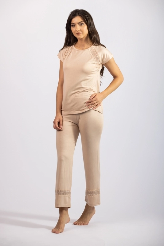 Bež ženska pidžama od viskoze sa kratkim rukavima idealna je za odmor. Zahvaljući svom materijalu savršeno se prilagođava telu, dok detalji od čipke dodaju dozu sofisticiranosti.