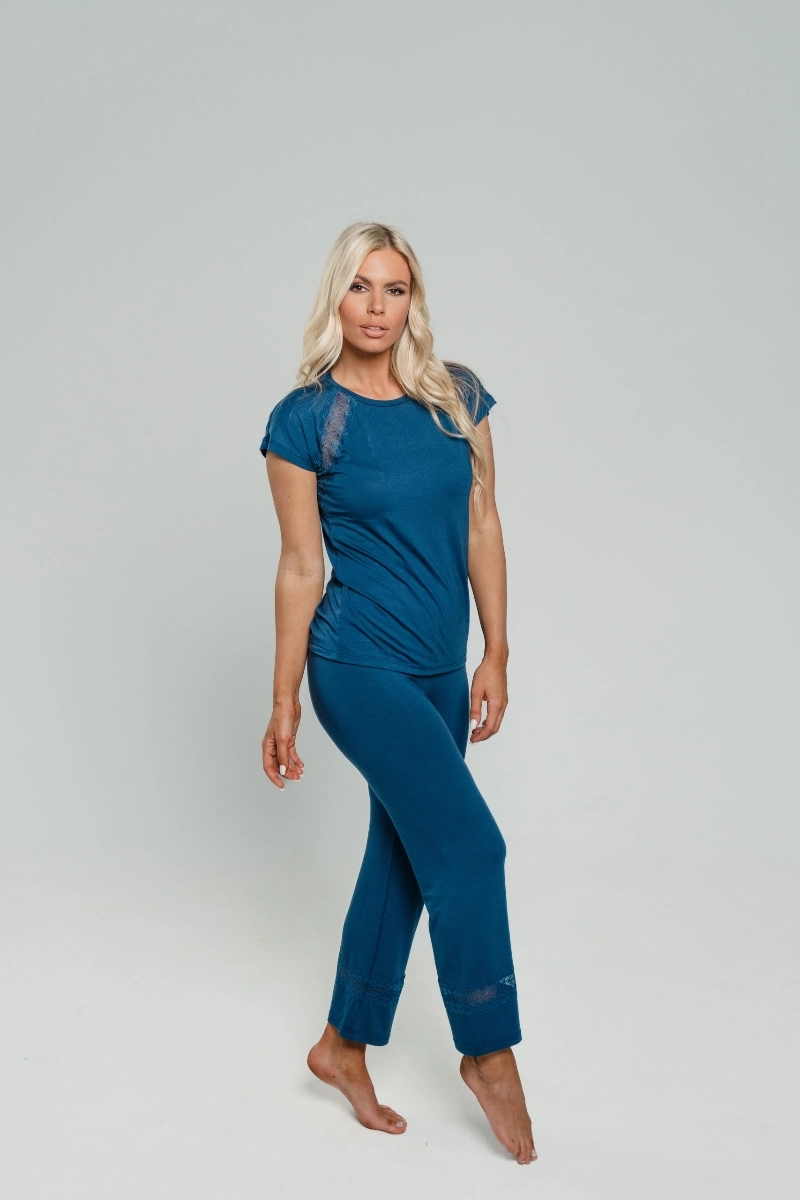 Teget ženska pidžama od viskoze sa kratkim rukavima idealna je za odmor. Zahvaljući svom materijalu savršeno se prilagođava telu, dok detalji od čipke dodaju dozu sofisticiranosti.