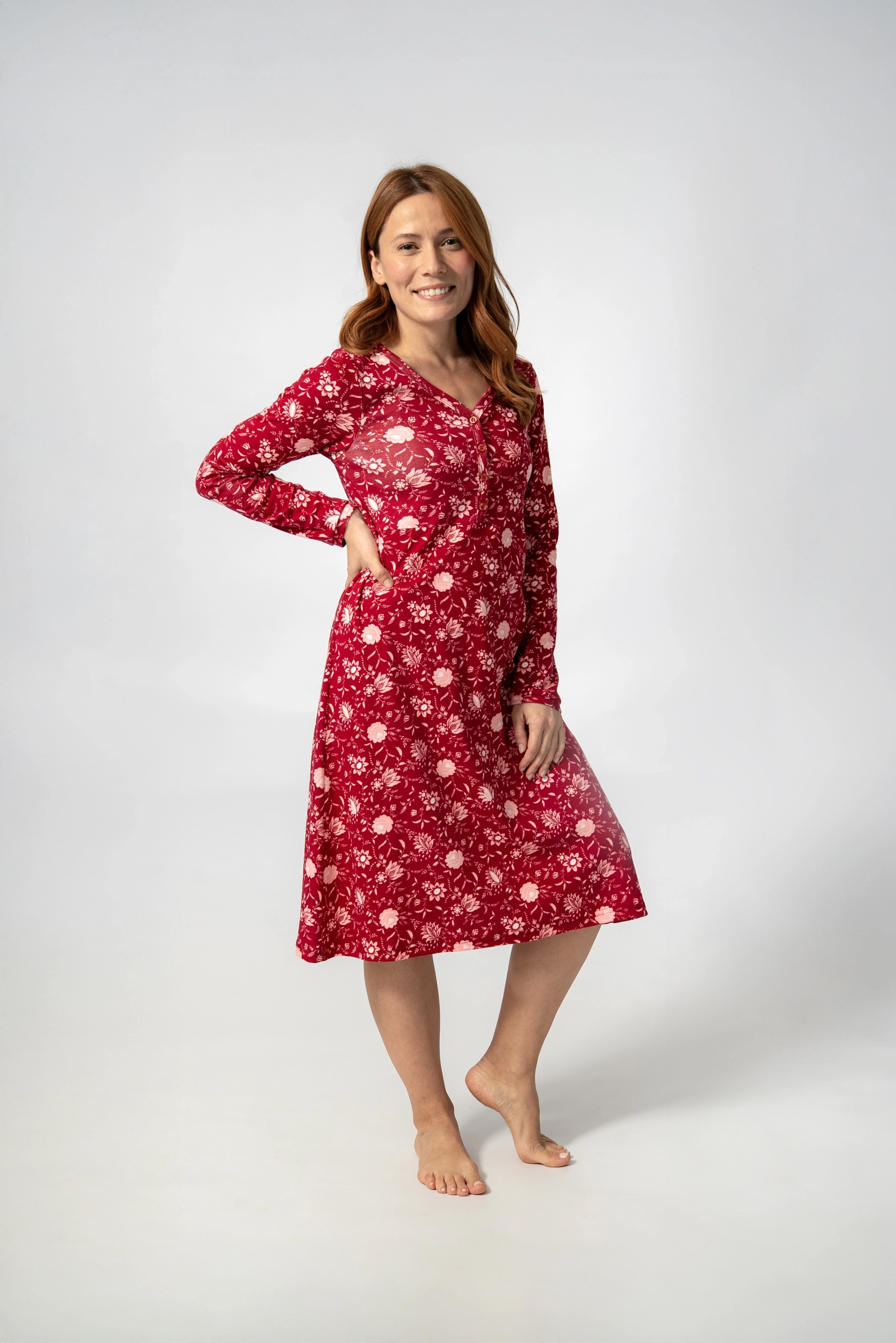 Ženska spavaćica od 100% pamuka idealan je izbor za udoban i miran san. Izrađena od prirodnog, mekanog pamuka, nežna je prema koži i pogodna za svakodnevno nošenje. Bordo boja s dekorativnim cvetnim dezenom daje ženstven i razigran izgled, dok klasičan kroj do kolena osigurava slobodu pokreta i maksimalnu udobnost.